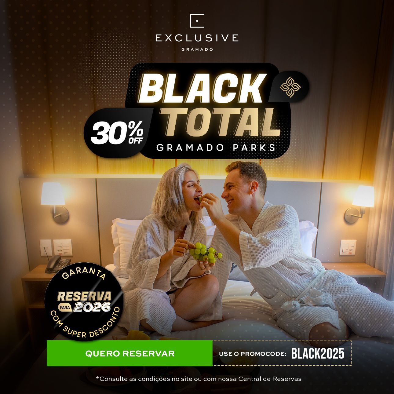Condições Legais: *Oferta válida para novas reservas efetuadas no período de 15 a 30/11/25 a utilizando o promocode BLACK2025. O desconto será aplicado para hospedagens a partir de 04/01/2026 até 30/09/2026. Condição válida exclusivamente para reservas através do site gramadoparkshoteis.com, central de reservas 0800 800 3737 ou whatsapp (54) 3905-4801. As reservas possuem pensão com café da manhã para todos os hóspedes. Transporte gratuito para os pontos turísticos Rua Coberta em Gramado e Catedral de Pedra em Canela/RS (agendamentos serão realizados no ato do check-in conforme disponibilidade e horários pré-definidos). Promoção não cumulativa com outras ofertas ou promoções e sujeito a alteração sem aviso prévio. Tarifa não reembolsável podendo ser dividida em até 06x vezes sem juros no cartão de crédito com parcela mínima de R$ 250,00. Para outras condições de hospedagem, consulte nossos canais oficiais de atendimento. Apartamentos limitados e disponibilidade da oferta sujeita à alteração sem aviso prévio.