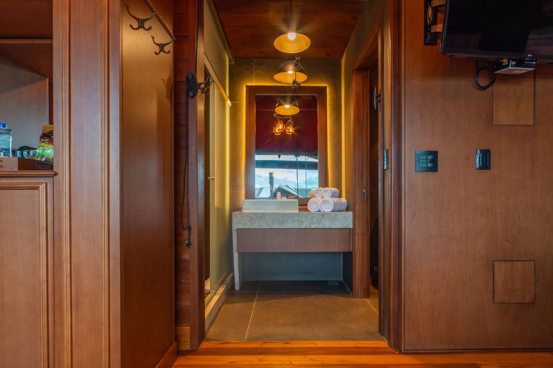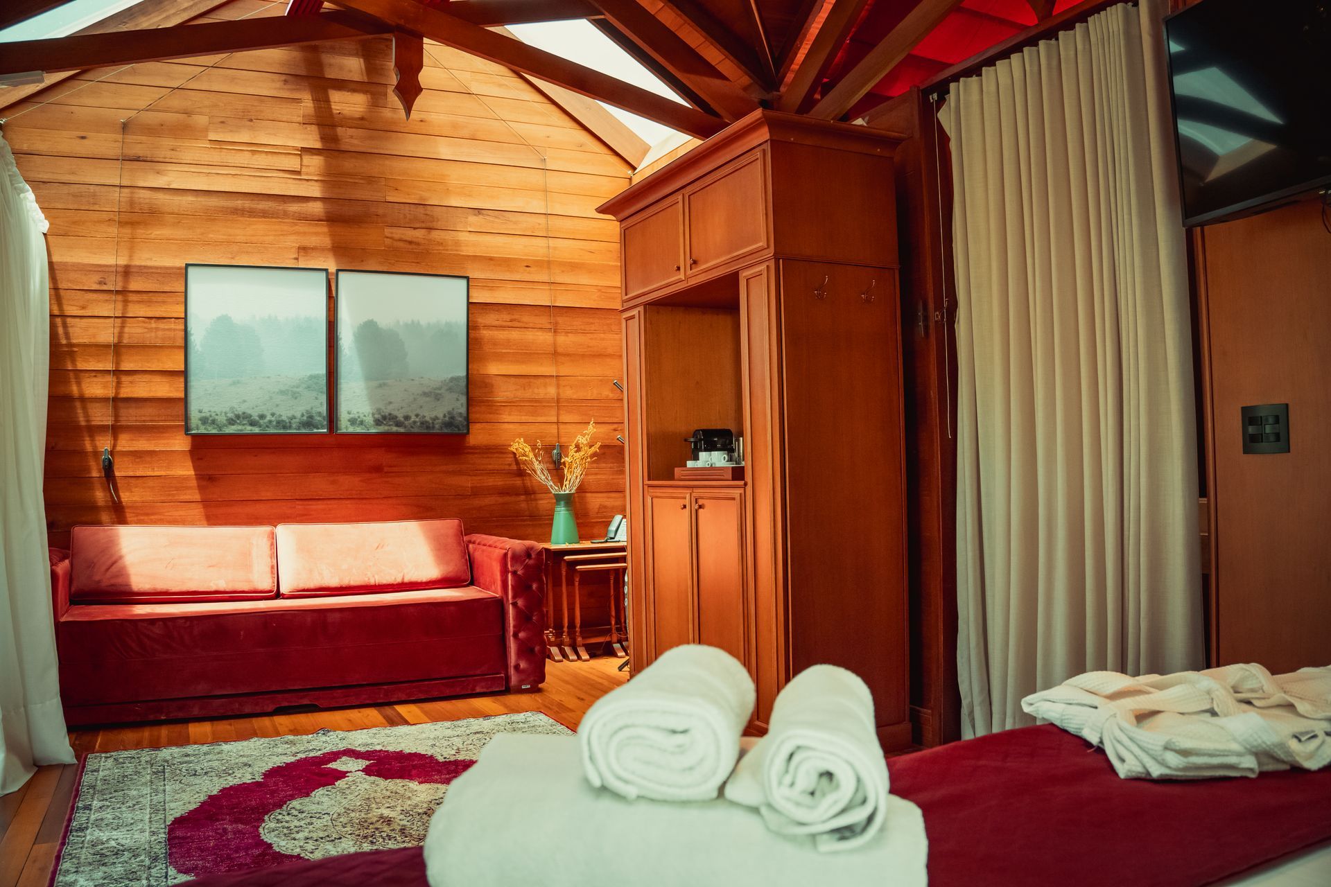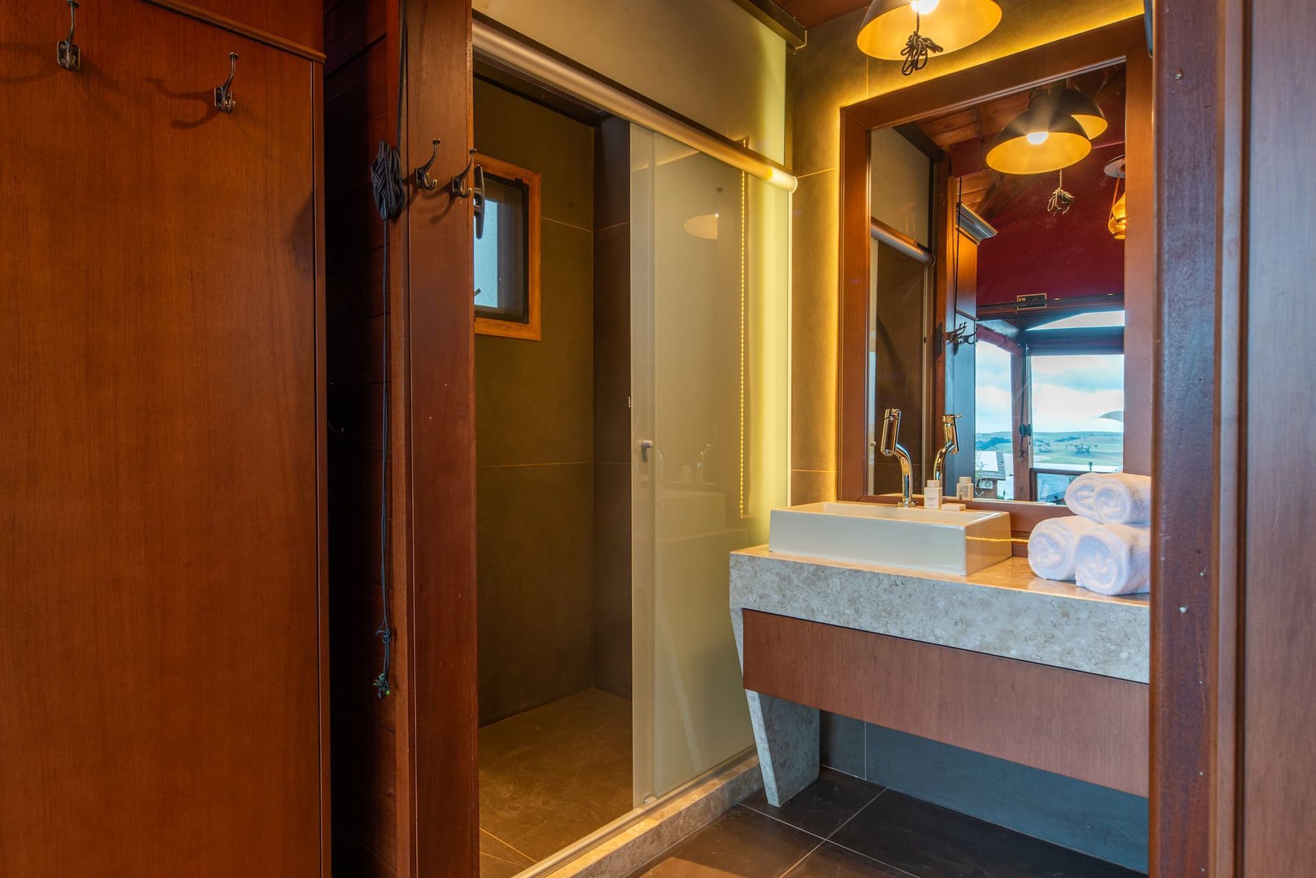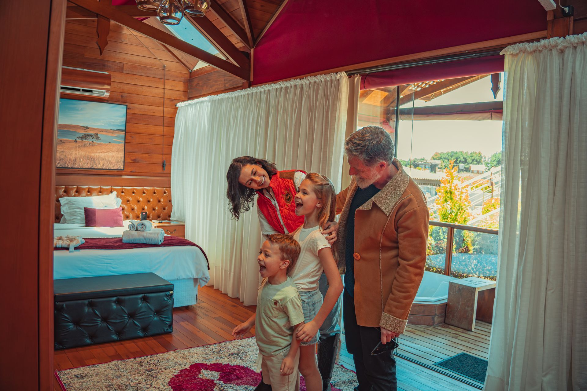 A Suíte Luxo, com mais de 70 m², está localizada na Praça Central. Ela dispõe de dois quartos: um com cama de casal e outro com duas camas de solteiro, além de um sofá-cama amplo e confortável, ideal para momentos em família ou com amigos. Ambientes climatizados garantem o seu bem-estar em qualquer estação. Para relaxar ao ar livre, desfrute de um deck com vista encantadora, um ofurô externo privativo e um firepit exclusivo, perfeitos para contemplar a natureza, aquecer as noites e viver experiências memoráveis com todo o conforto.
