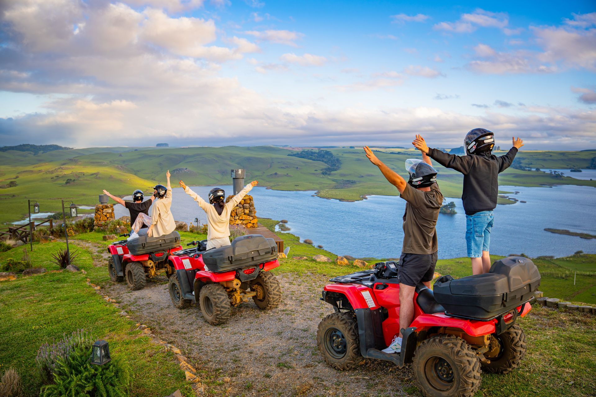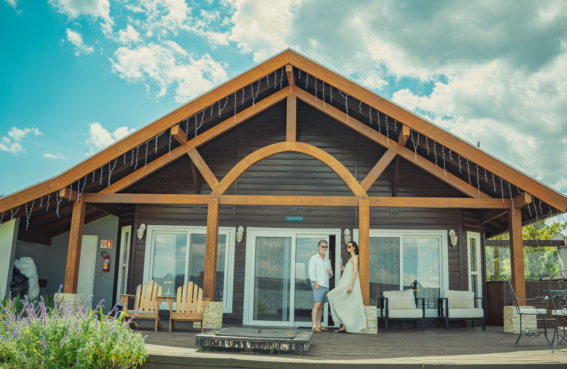 A Suíte Master, com mais de 70 m², está localizada de frente para a Barragem, proporcionando uma vista deslumbrante. Ela dispõe de dois quartos: um com cama de casal e outro com duas camas de solteiro, além de um sofá-cama amplo e confortável, ideal para momentos em família ou com amigos. Para relaxar ao ar livre, desfrute de um deck com vista encantadora, um ofurô externo privativo e um firepit exclusivo, perfeitos para contemplar a natureza, aquecer as noites e viver experiências memoráveis com todo o conforto.