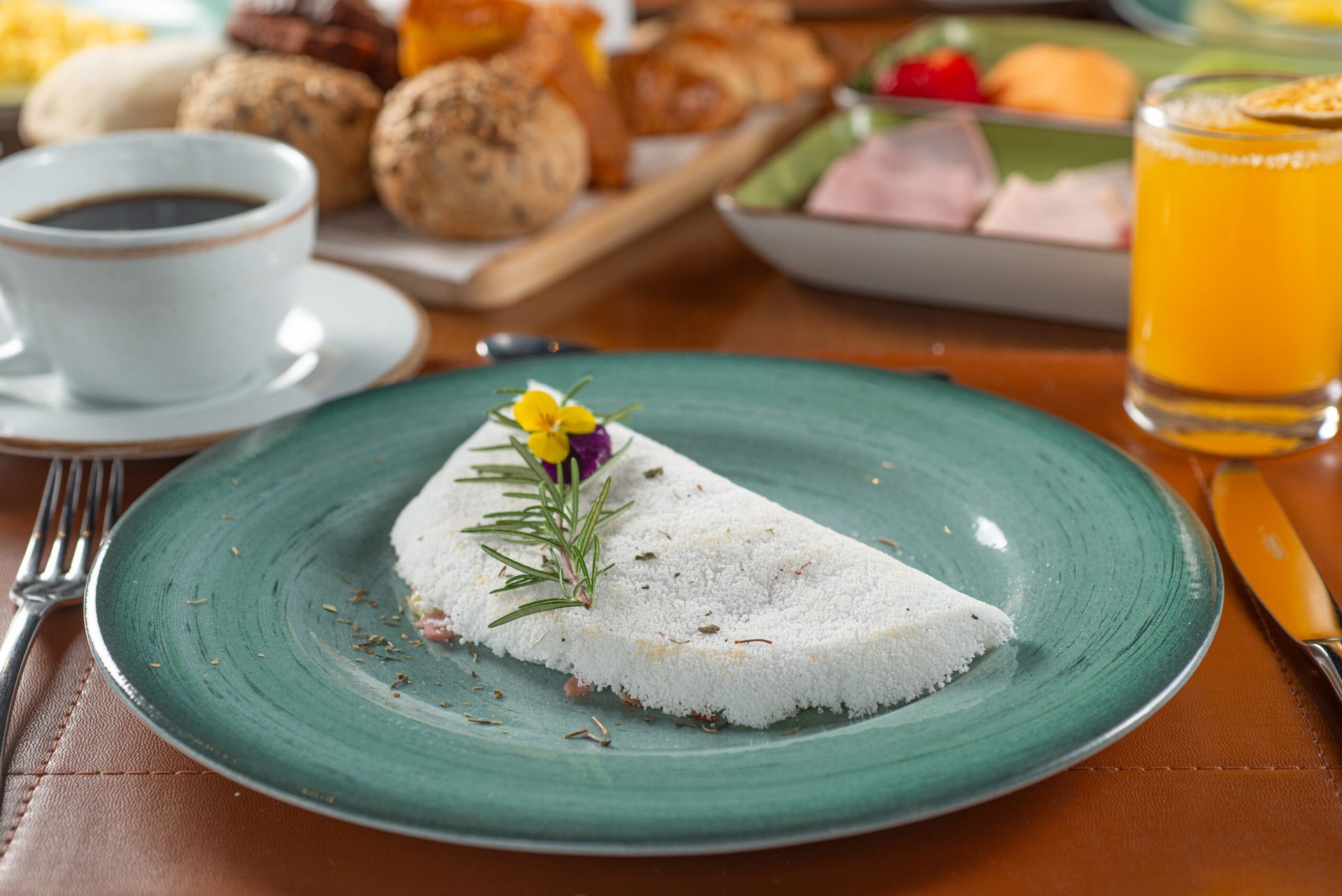 No café da manhã, além de um buffet completo com uma ampla seleção de ingredientes caseiros, você pode aproveitar pratos à la carte, como tapiocas feitas na hora, ovos beneditinos e waffles servidos com geleias artesanais, preparados com todo cuidado para começar o dia com prazer.